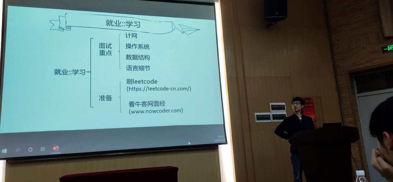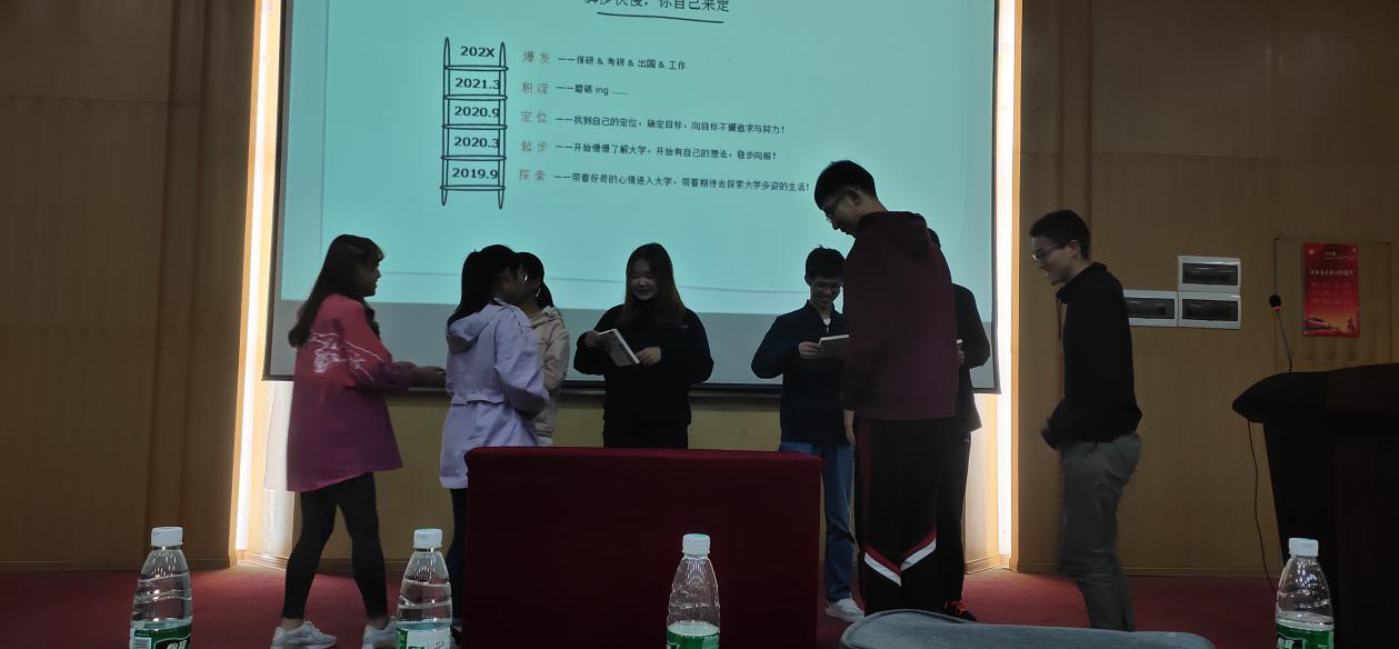 魏学长简洁凝练的宣讲介绍了保研、考研、工作的选择取舍。给我们大学四年大致的阶段性计划提出了建议。并介绍了考研保研所需要做的准备工作。如给了我们选择通识课的建议等。告诉我们班委和员工工作组织能做的工作和应该提升的能力,鼓励我们多出去走走增长见识。