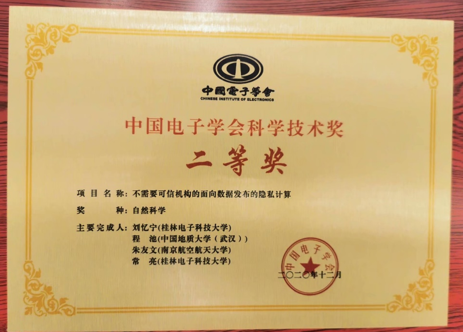 (通讯员:章丽平)2021年4月17-18日,中国电子学会2020年度科学技术奖励大会在重庆举行。304.cam永利集团信息安全系程池老师与桂林电子科技大学、南京航空航天大学的学者共同完成的“不需要可信机构的面向数据发布的隐私计算”荣获2020年度中国电子学会科学技术奖自然科学二等奖。郝跃院士、刘明院士等23位院士出席大会并颁奖。