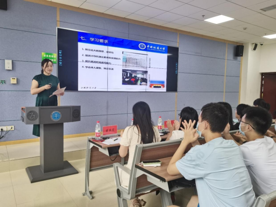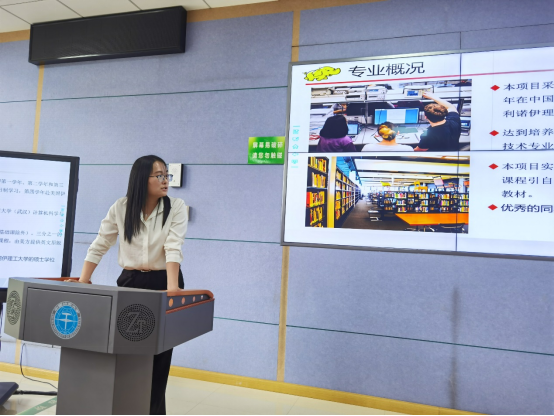 张冬梅做项目介绍,她从基本情况、团队队伍、招生情况、课程情况等方面向同学们介绍了项目的整体情况,并希望同学们在校期间培养专业素养和实践能力、提升英语水平,努力成长为德智体美劳全面发展的国际化人才。