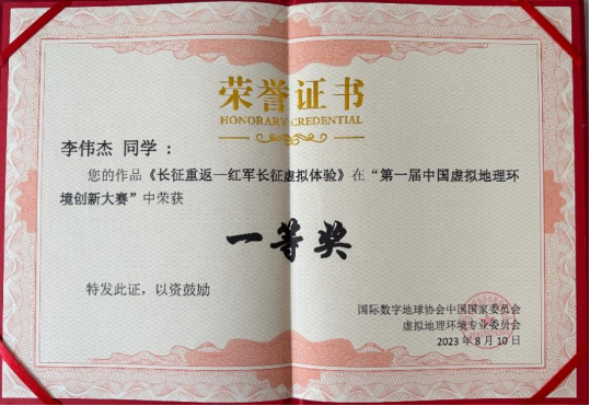 本次竞赛从2023年2月开始到作品提交结束,整个过程历时五个月。李伟杰等五名同学在邱芹军、刘郑和陶留锋三名老师的指导下,查阅了虚拟地理环境的文献资料,师生讨论确实赛道与选题并定期组织会议完成进度,对作品进行反复修改与完善,认真撰写项目实施方案,最终提交了出色的作品,通过专家初审评阅和现场汇报等环节的严格筛选,他们最终脱颖而出,荣获一等奖。他们的杰出表现展现了公司学子的才华,彰显了公司学子在学术和团队合作方面的卓越素养。