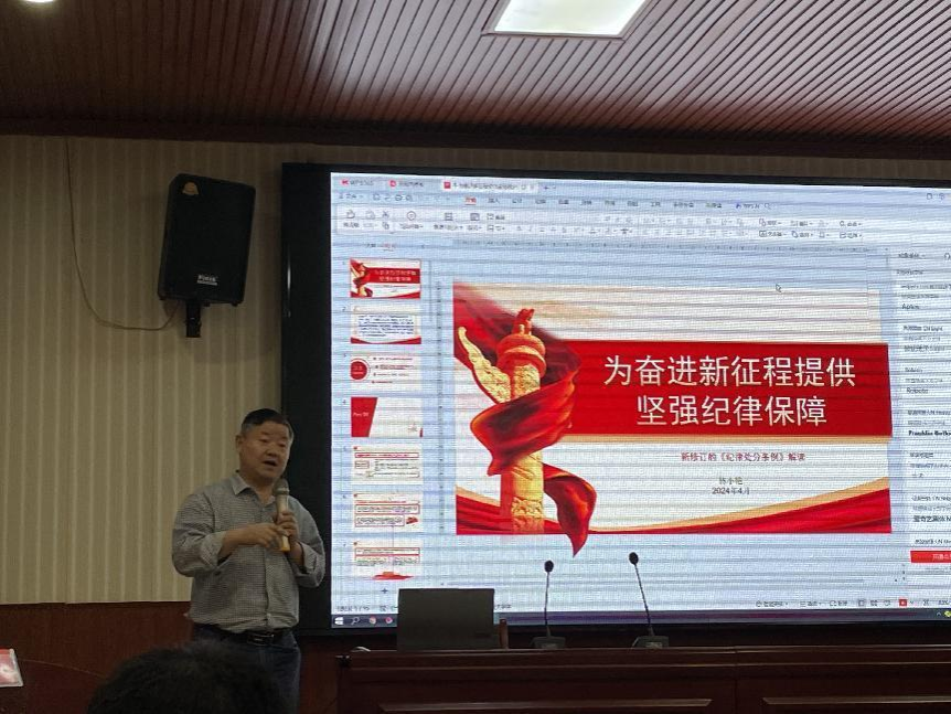 为贯彻落实习近平总书记关于推进党的自我革命、全面加强党的纪律建设重要论述精神,按照党纪学习教育要求,4月13日下午,304.cam永利集团以学习贯彻新修订的《中国共产党纪律处分条例》为契机,开展集中性纪律教育。公司全体教师党员参加学习,公司党委书记李国昌主持活动。