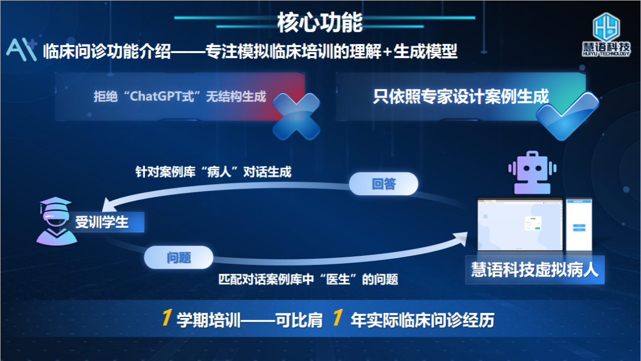 该项目把计算机专业知识与医学问诊相结合,主要目的是提升医生问诊能力。医生问诊能力是一个医生必备的专业技能。培养医员工的问诊技能,需要有病人或模拟病人的配合,一直以来效率低下。针对上述痛点,该项目推出了一个医员工问诊培训的学习软件,根据具体的医学科别,模拟病人,回复医员工的各种问题,完成整个问诊的过程,最后根据医员工在问诊交流中的表现给出得分。该项目背后的医学支撑和技术支撑扎实,具有充分的市场空间和市场需求,盈利潜力巨大,具有重大社会意义和产业前景。