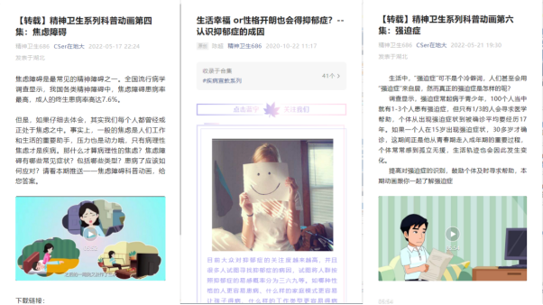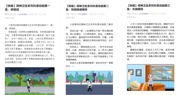 为加强同学们对心理健康知识的了解,在心理健康宣传月中,公司转载了“精神卫生系列科普动画”共计六集,转载分享了抑郁症成因和焦虑自助等科普文章。本系列科普视频和文章的传播,为心理健康宣传月塑造了良好的氛围。