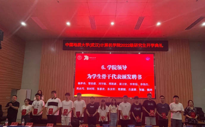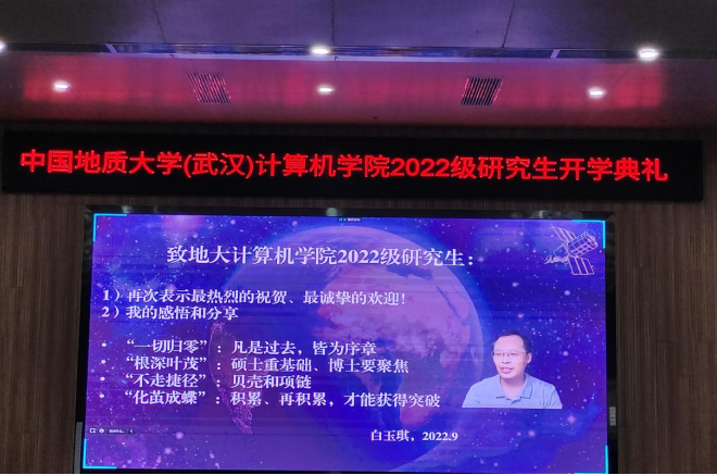 研究生导师蒋良孝教授发言。他代表全体导师向2022级研究生新生的到来表示欢迎和祝贺,同时,就研究生阶段的科研学习提出五点建议:一是要培养归宿感,真正做到“今天我以地大为荣”;二是要诚实守信,做人做事有闭环;三是要亲其师而信其道,信其道而受其教;四是要打好基础,潜心研究;五是要敢于亮剑,努力实现“明天地大以我为荣”。
