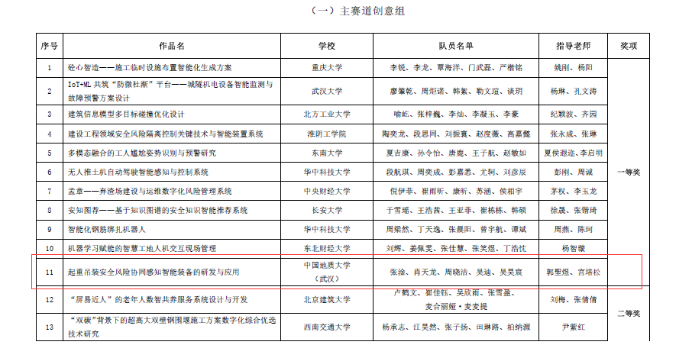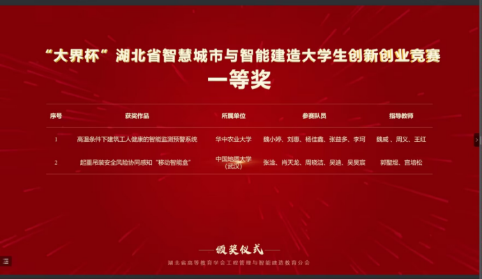 据悉全国智慧城市与智能建造老员工创新创业竞赛是当前工程管理领域影响力最大、影响范围最广的学科竞赛。本次比赛,304.cam永利集团2021级本科生吴昊宸与经济管理公司工程管理专业组成联队(团队成员:张淦、肖天龙、周晓洁、吴迪、吴昊宸),以参赛作品“起重吊装安全风险协同感知智能装备的研发与应用”(指导老师:郭聖煜、宫培松)进入决赛,最终从大赛主赛道来自98所高校的107支队伍的参赛作品中脱颖而出,荣获一等奖。此前在“大界杯”湖北省智慧城市与智能建造老员工创新创业竞赛中,该参赛作品已经获得一等奖。